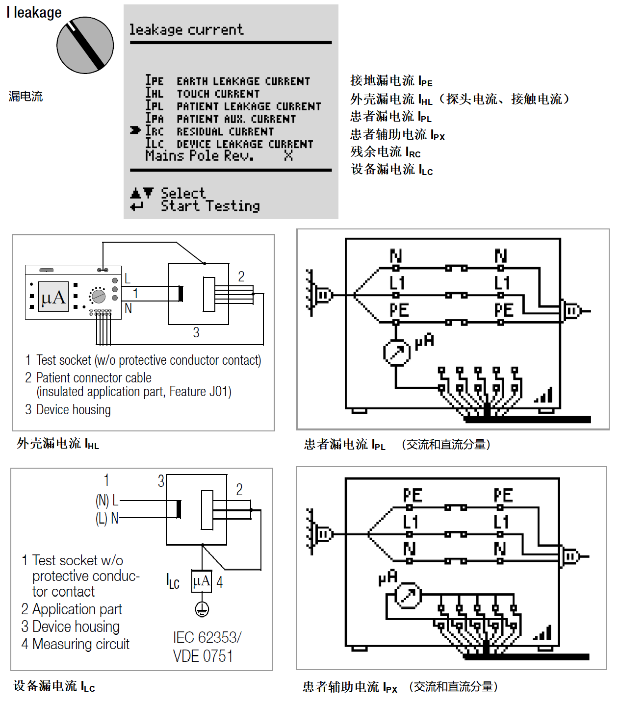 適用于專業(yè)評價實驗室、醫(yī)院和制造商對便攜式商用電氣設備和醫(yī)用電氣設備進行電氣安全例行測試和型式試驗。執(zhí)行保護導體連接性,絕緣電阻和泄漏電流的測試(差分電流, 等效泄漏電流, 設備漏電流, 患者端口泄漏電流, 接觸電流)