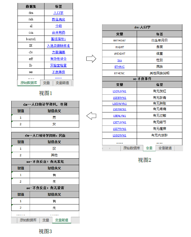 數據說明文件用于描述原始數據庫和分析數據庫的內容和結構,有助于審閱者快速了解數據庫中各數據集、變量及其相互間的結構關系,準確理解遞交的數據內容。建議采用Excel文件,以表格的形式分別列明原始數據庫和分析數據庫中所含的數據集、變量、變量類型(如字符型、數值型)、標簽、賦值及其對應關系,具體可參考附錄1《數據集、變量關系列表舉例》。為了便于審閱,數據集和變量應具有相應的中文標簽,標簽長度不宜過長。若使用了外部詞典(如MedDRA),應明確使用的外部詞典名稱和版本號。