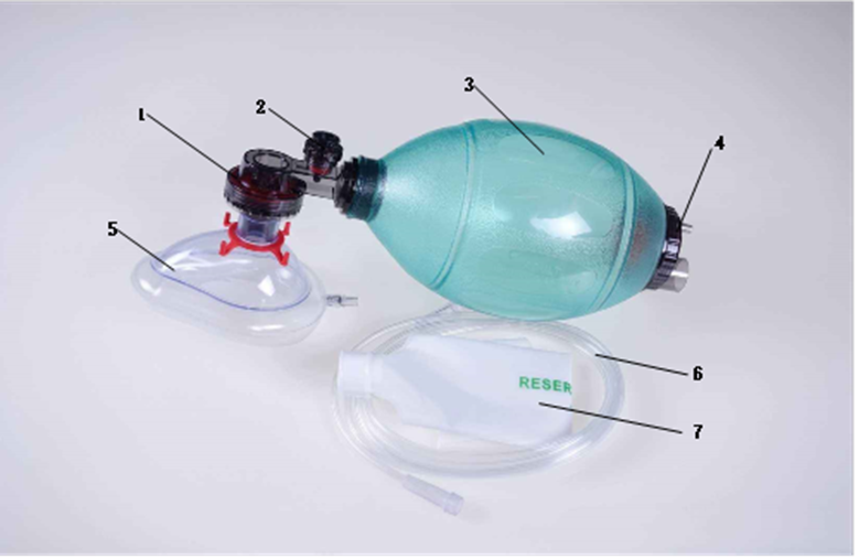 1-病人閥 ; 2-限壓閥; 3-呼吸球囊; 4-進(jìn)氣閥組;5-面罩(選配); 6-氧氣管(選配); 7-儲(chǔ)氣袋(選配)